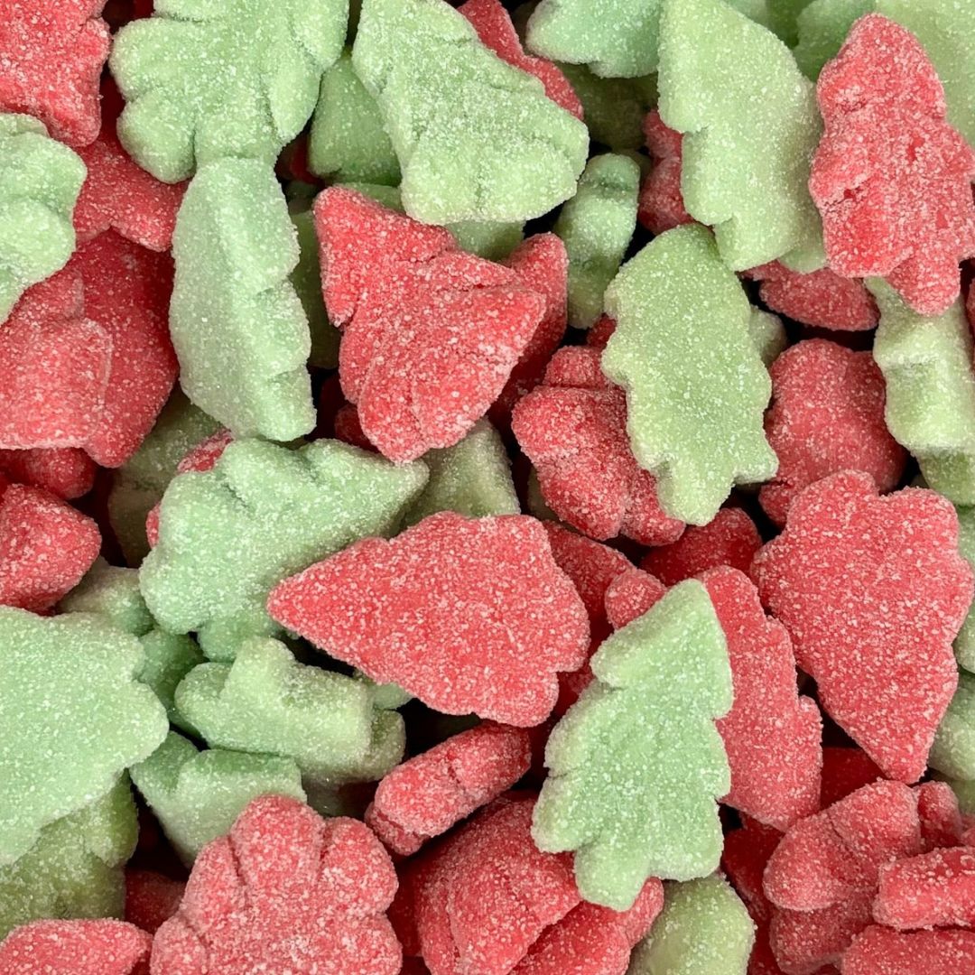 Sugar-coated, green & red Christmas Trees from the UK, in delicious strawberry & apple flavours.