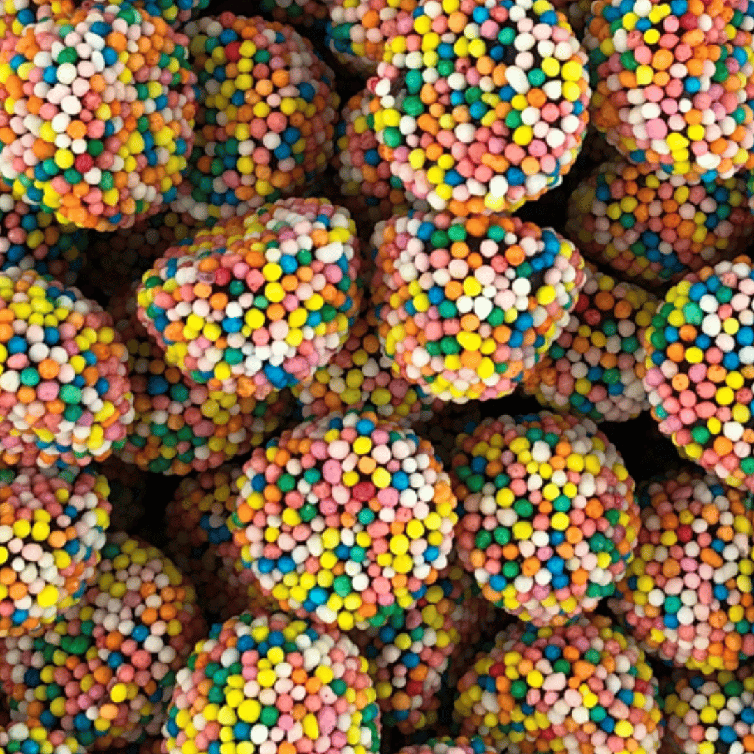 A dome shaped jelly coated in 100s and 1000s with an aniseed licorice flavour.