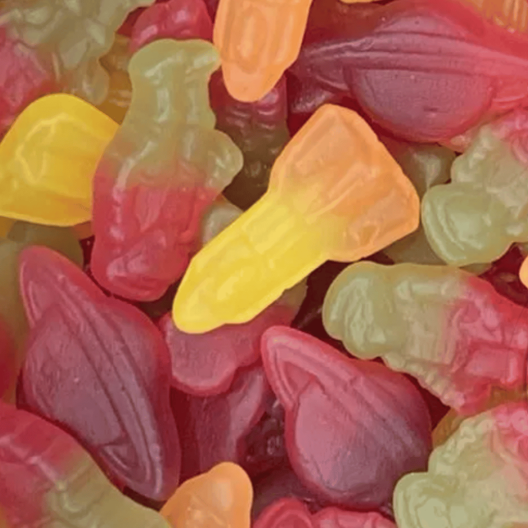 Ingredients: Sugar, glucose syrup, wheat starch, water, modified maize starch, modified potato starch, acids (lactic acid, malic acid, citric acid), flavourings, fruit and vegetable concentrates (spirulina, safflower, black carrot, grape), colours (curcumin, paprika extract), vegetable oils (coconut), glazing agent (carnauba wax)