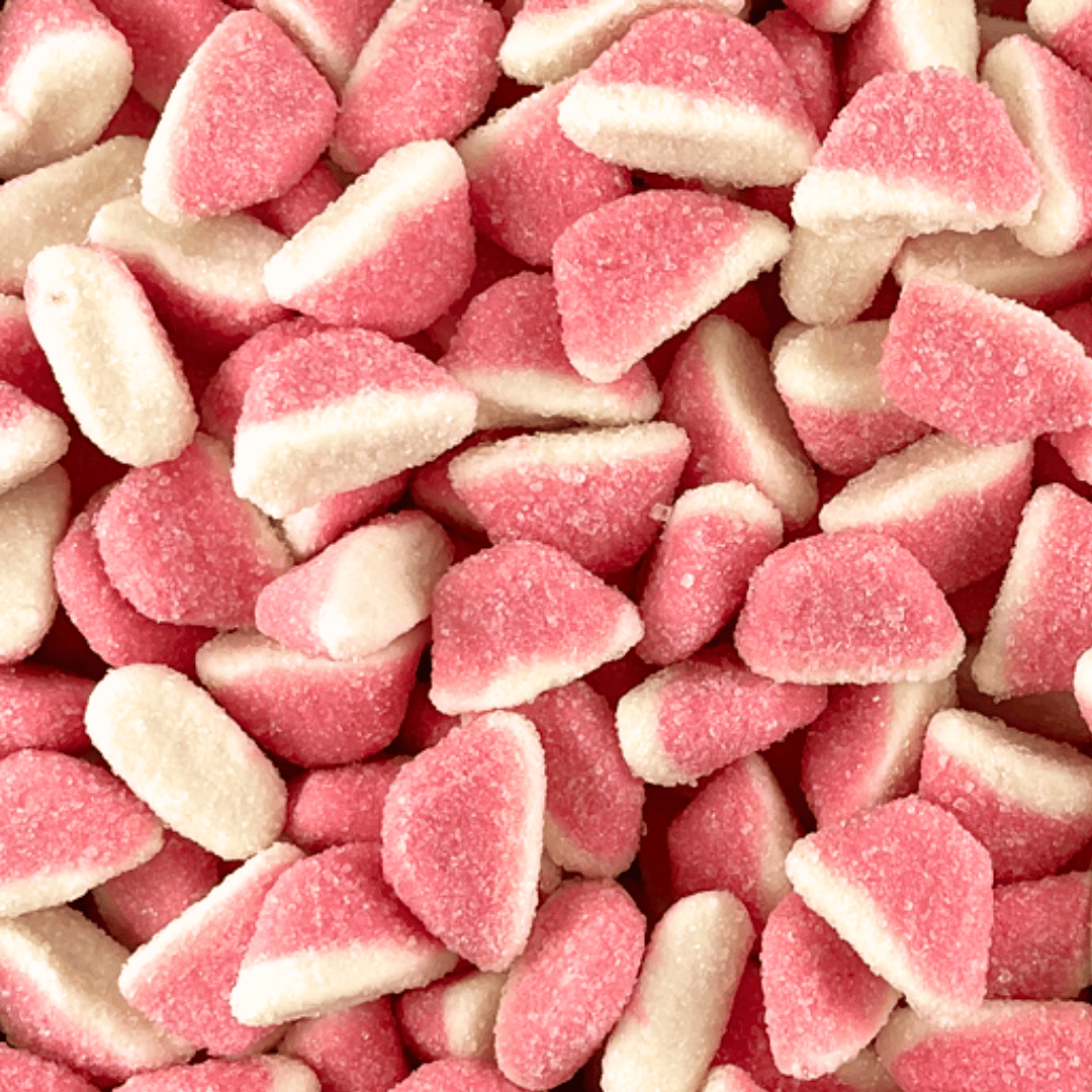 From Kervan USA, Strawberry Cake is a petite sugar coated gummy candy with a white bottom and pink top.